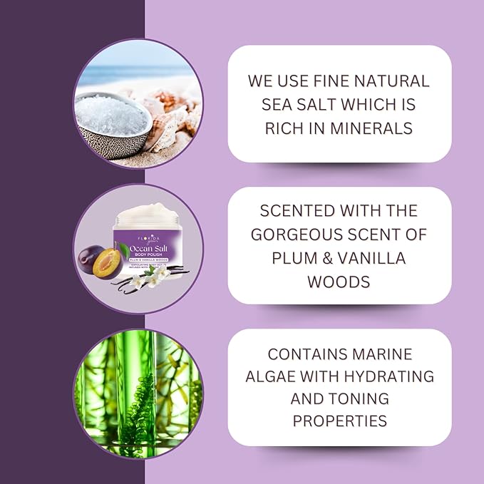 Sea Salt Body Scrub by Florida Suncare - Ocean Salt Body Polish Infused with Marine Algae - Exfoliating Face and Body Scrub, Facial Scrub Exfoliator to Tackle Acne, Scars (Plum & Vanilla Woods 12.1oz)