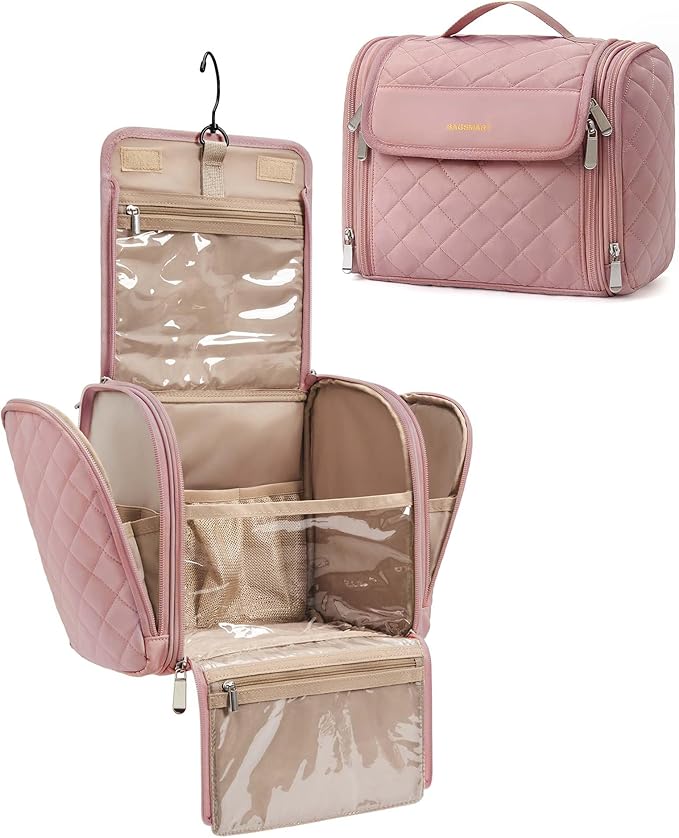 BAGSMART Makeup Bag for Women with Hanging Hook, Large Portable Capacity Water-resistant Organizer Travel Case for Toiletries and Cosmetics, Pink
