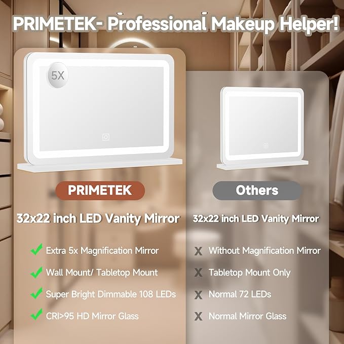 - ✅Customizable Lighting for Versatile Use: The 32"x22" LED vanity mirror features 3-color lighting modes, including cool white, warm white, and natural light, making it easy to customize your makeup routine depending on the lighting needs.