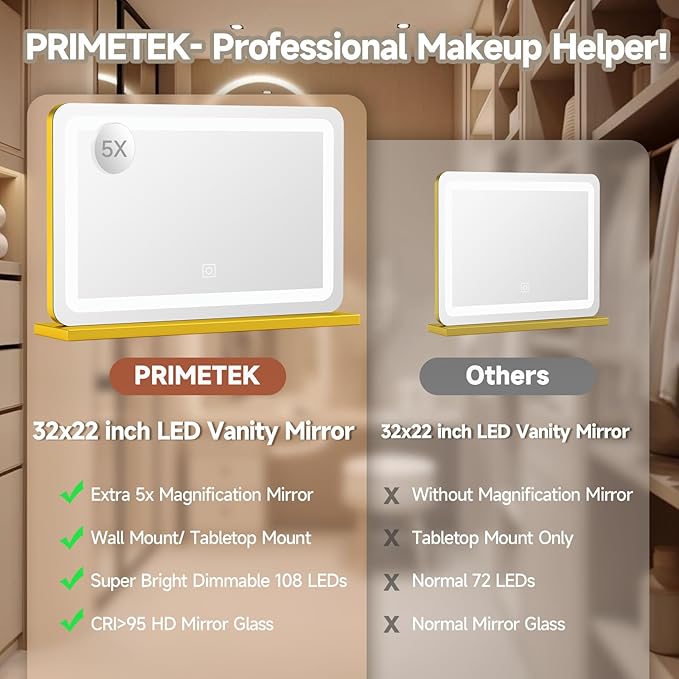 Large Vanity Mirror with Lights 32"x22", Lighted Makeup Mirror, Wall-mounted Hollywood Vanity Mirrors, Touch Sensor, 3-Color Lighting, 5X Magnification, USB Port for Vanity Desk Tabletop, Salon, Gold