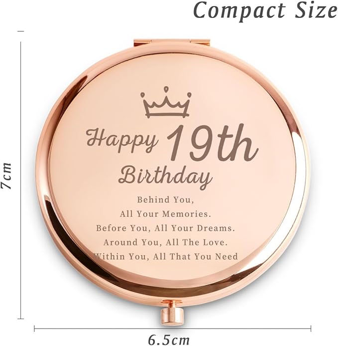 • Customized Gifts: this custom makeup mirror is engraved with the motivational message: "19th Happy Birthday, Behind You, All Your Memories. Before You, All Your Dreams. Around You, All The Love. Within You, All That You Need" making it a truly meaningful present for women.