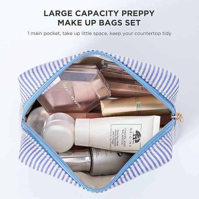 - 【Large Capacity】This seersucker makeup bag set includes two bags with a stylish striped design. The large makeup pouch measures 10.6x7.1x2.4 inches, and the small cosmetic bag is 6.9x4.1x2.7 inches. They are perfect for holding your daily cosmetics and travel essentials