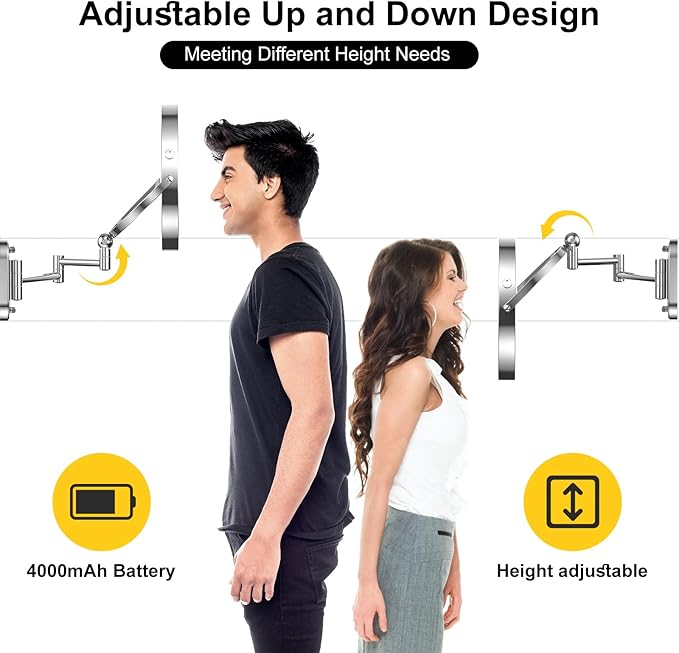 • 360°Rotation & Extendable Arm Makeup Mirror: The multiple joints of the wall-mounted makeup mirror with retractable arm allows you to fix the mirror in the best position and adjust the arm to any angle you need to achieve perfect viewing.The flexible mirror arm can be freely extended so that the magnifying mirror can be adjusted to the right viewing angle and distance, allowing you to freely apply makeup,shaving or wearing contact lenses, etc. You can fold the mirror on the wall to save space when you are not using it.