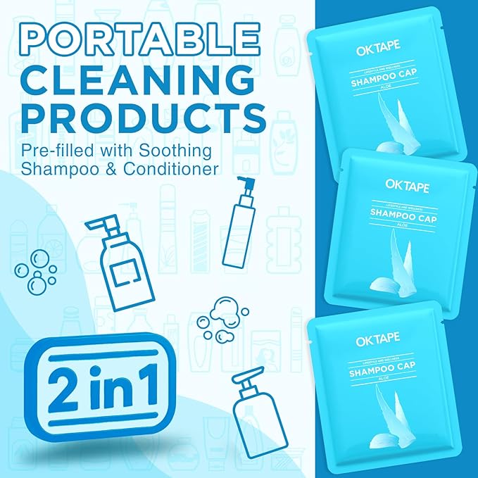 - [Convenient Cleaning Anytime, Anywhere] OK TAPE rinse free shampoo cap does not need water at all, allowing you to achieve waterless shampoo and conditioner without showering and bathing.