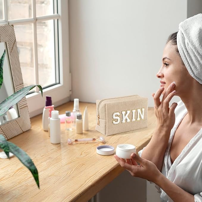 • 【GLITTER CHENILLE LETTERS & PRACTICAL LABELS】 Each make up bag features chic chenille letter patches, securely stitched with labels: HAIR, FACE, STUFF, SKIN. This elegant design adds a stylish touch while helping you easily categorize and access your cosmetics and toiletries.