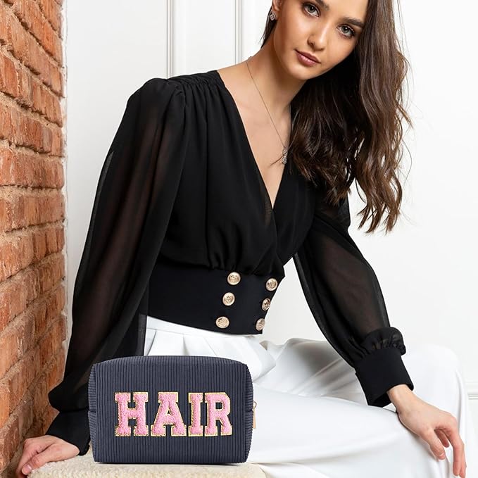 • 【GLITTER CHENILLE LETTERS & PRACTICAL LABELS】 Each make up bag features chic chenille letter patches, securely stitched with labels: HAIR, FACE, STUFF, SKIN. This elegant design adds a stylish touch while helping you easily categorize and access your cosmetics and toiletries.
