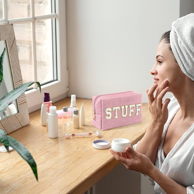 • 【GLITTER CHENILLE LETTERS & PRACTICAL LABELS】 Each make up bag features chic chenille letter patches, securely stitched with labels: HAIR, FACE, STUFF, SKIN. This elegant design adds a stylish touch while helping you easily categorize and access your cosmetics and toiletries.