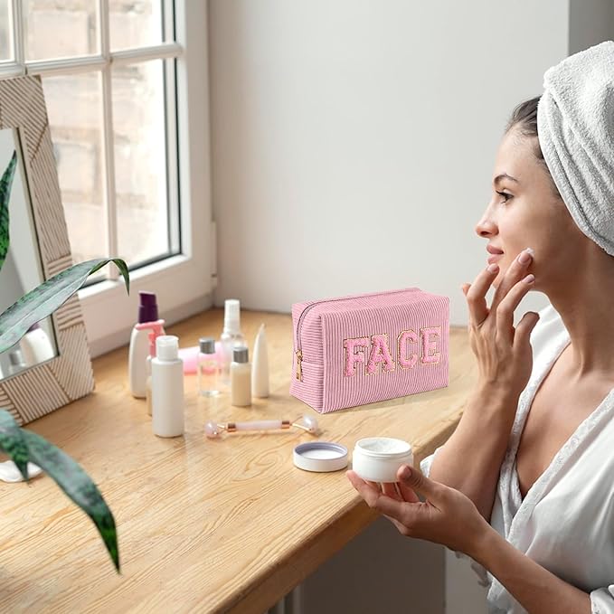 • 【GLITTER CHENILLE LETTERS & PRACTICAL LABELS】 Each make up bag features chic chenille letter patches, securely stitched with labels: HAIR, FACE, STUFF, SKIN. This elegant design adds a stylish touch while helping you easily categorize and access your cosmetics and toiletries.