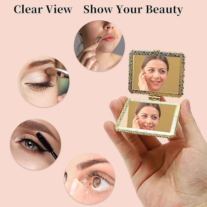 - Full Face Viewing: The small compact mirror with a 2.6" W x 2.91" L viewing area, you can checking your skin conditions at any time, applying lipsticks and mascara creams, wearing earrings and more, very convenient to carry when going out