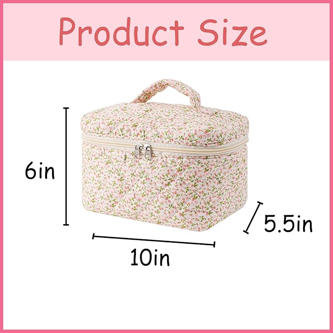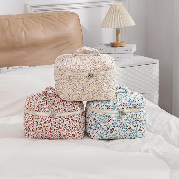 uekeboag Large Travel Quilted Makeup Bag for Women, Floral Cotton Cosmetic Bag, Coquette Aesthetic Floral Toiletry Organizer Bag
