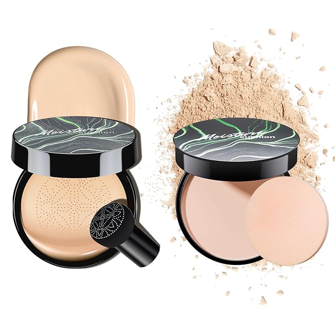 Mushroom Head Air Cushion CC Cream with Setting Powder Makeup Set, Blurs Fine Lines & Imperfections, Controls Shine & Smooths Complexion, Even Skin Tone for All Skin Types for Women (Natural)