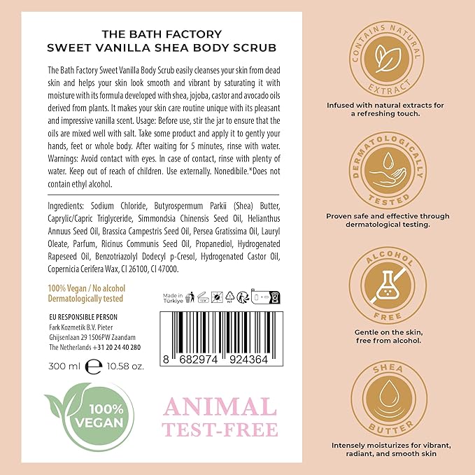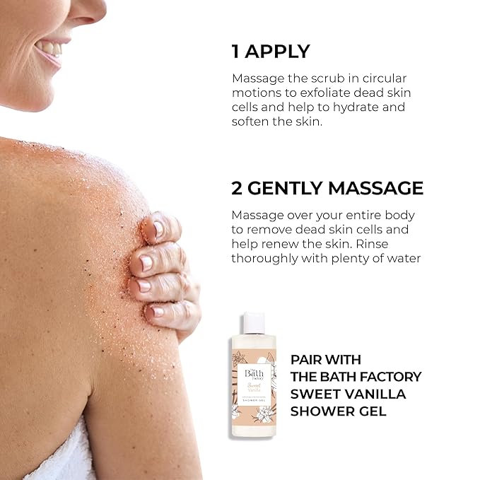 - VANILLA EXTRACT = Enriched with vanilla extract, this body scrub offers a soothing and hydrating treatment, exfoliating gently while leaving your skin soft, smooth, and delicately scented for a luxurious pampering experience.