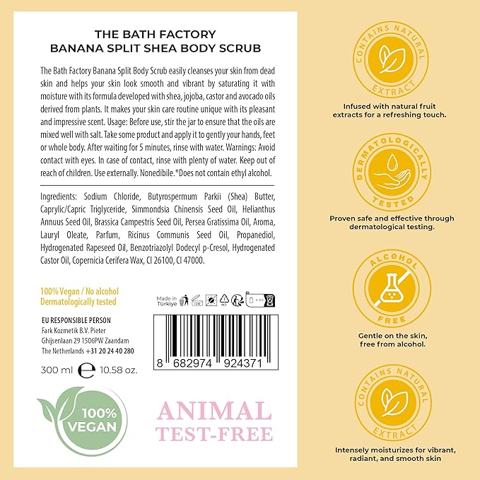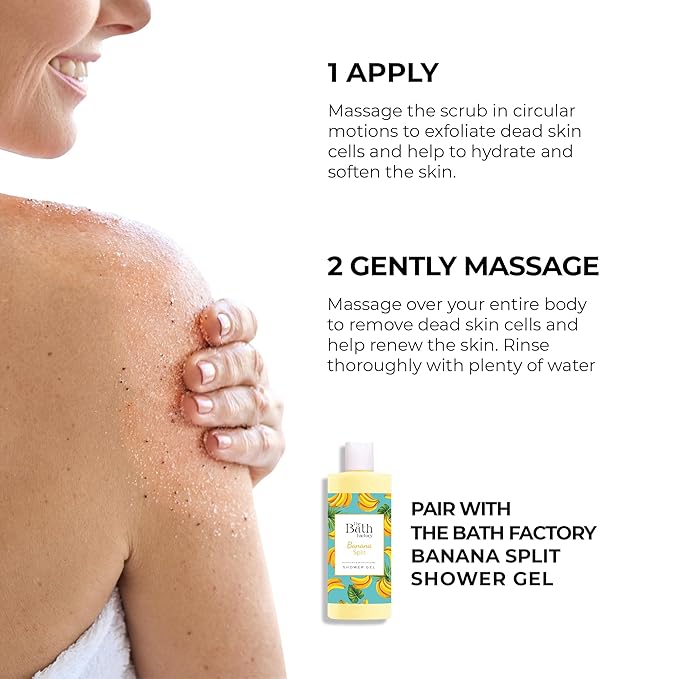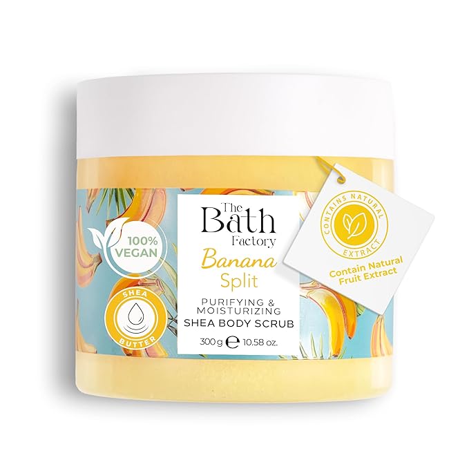 - BANANA EXTRACT = This body scrub deeply moisturizes and nourishes your skin with vitamins and minerals from Musa Sapientum Fruit Extract, smoothing and refining skin texture for a refreshed and glowing appearance.