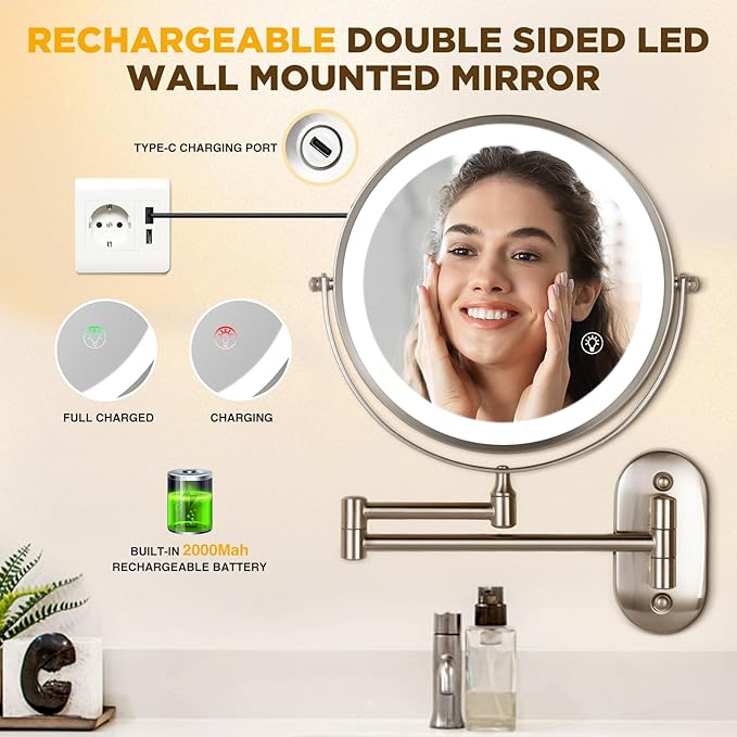 • 【Rechargeable Makeup Mirror Easy to Install】 Built-in 2000mAh rechargeable Lithium battery, comes with a Type-C cable (not including adaptor). With 30 minutes of daily use, it can last up to 10 days without needing to be charged, so you don't need to replace the battery frequently. All installation accessories and instructions come with the wall-mounted mirrors in the package. The makeup mirror wall mounted is easy to install, anyone can install it in 5 minutes.
