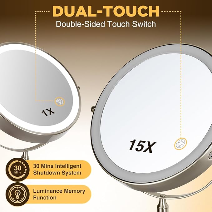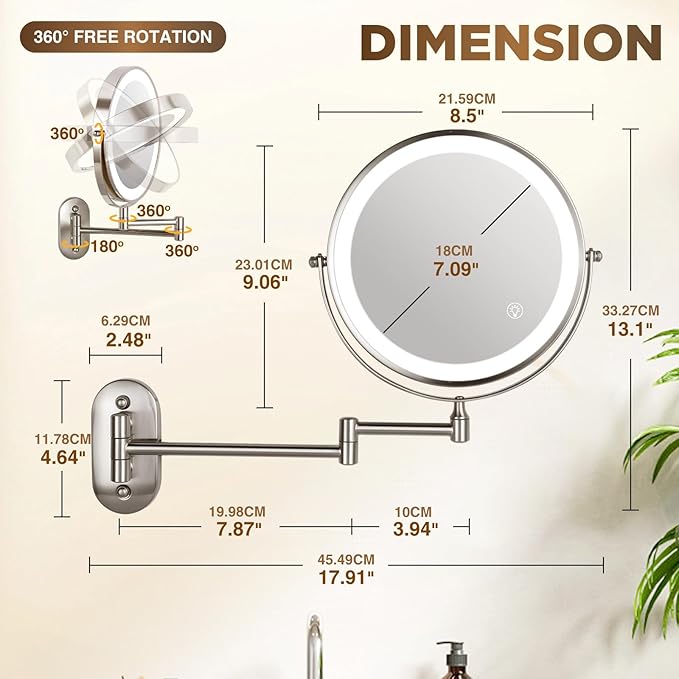 • 【360° Rotatable and Extendable Arm】 360° free rotation and telescoping arm, up to 12 inches in length, so you can adjust it to the angle you want and switch between the 1x and 15x mirrors. Perfect for people with poor-eyesight and no need to bend your waist anymore. The magnifying makeup mirror with extending arm can save space effectively. When not in use, fold it flat to the wall to save space.