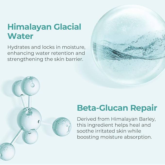 - Mineral-Rich Hydration: Himalayan Glacial Water deeply hydrates, enhancing moisture retention and strengthening the skin barrier for soft, plump skin.