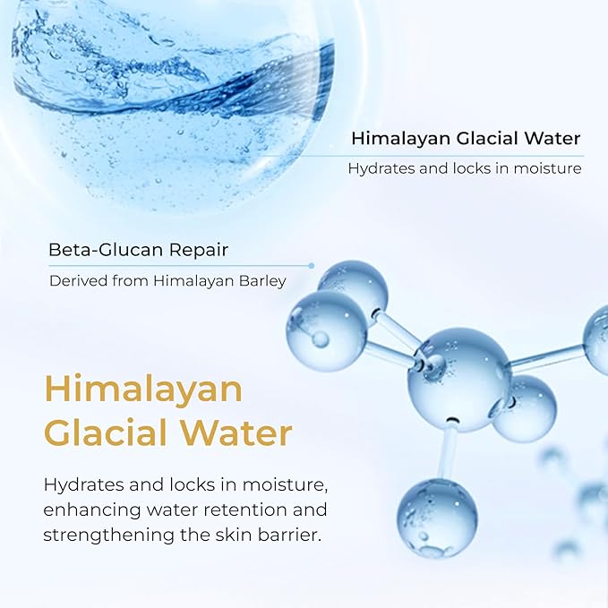 - Mineral-Rich Hydration: Himalayan Glacial Water deeply hydrates, enhancing moisture retention and strengthening the skin barrier for soft, plump skin.