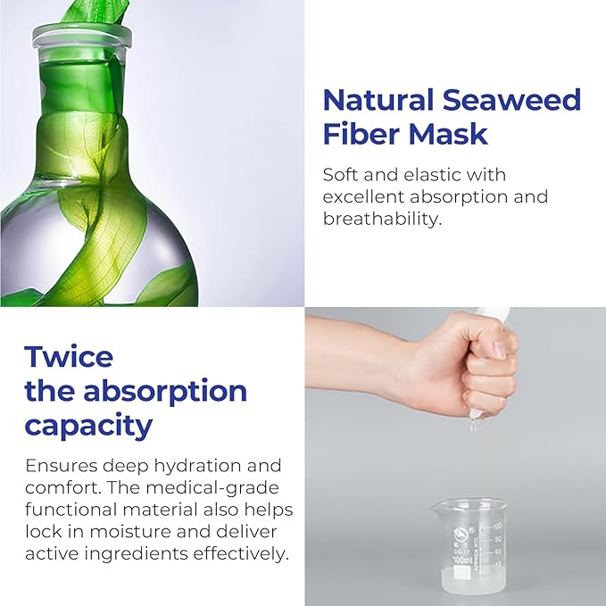 - Enhanced Absorption: Made from natural seaweed fiber, it offers twice the absorption capacity of silk, ensuring deep hydration and comfort. The medical-grade functional material also helps lock in moisture and deliver active ingredients effectively.