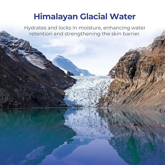 - Mineral-Rich Hydration: Himalayan Glacial Water deeply hydrates, enhancing moisture retention and strengthening the skin barrier for soft, plump skin.