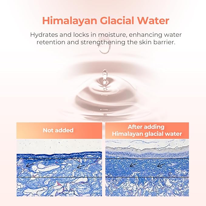 - Mineral-Rich Hydration: Himalayan Glacial Water deeply hydrates, enhancing moisture retention and strengthening the skin barrier for soft, plump skin.