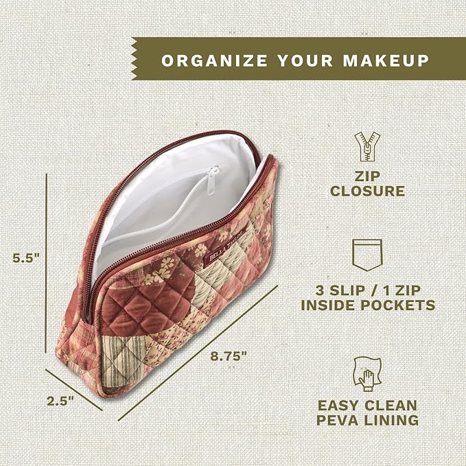 Bella Taylor Large Makeup Pouch for Women | Quilted Cotton Cosmetic Bag for Travel and Organization | Burgundy Patch