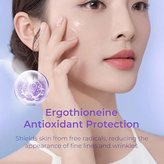 - Fights Signs of Aging: Ergothioneine offers deep antioxidant protection, neutralizing free radicals that cause aging. This ingredient helps reduce wrinkles and maintains skinβs youthful elasticity, giving your skin a firmer, smoother appearance.