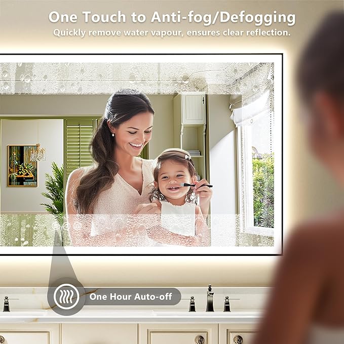 • 🔥【Anti-Fog/Defog, Clear Reflection】- Still troubled by the fog on the mirror after shower? This anti-fog lighted mirror can free you from this trouble. Turn on the defogger can quickly remove water vapor, always maintain a clear reflection. It will auto turn off after an hour. Long press the "Anti-fog" button can turn off the blue light of 3 buttons.