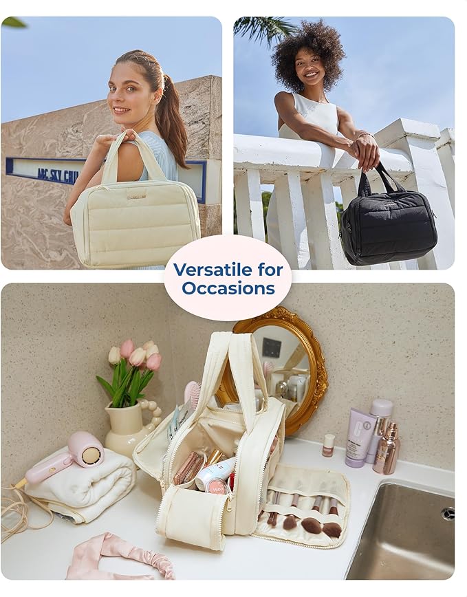 • Easy Access and Keep Upright : Full opening and not piling up for easy access to items. Double side full open design of travel bag keeps cosmetic bottles and toiletries can stand upright in the middle compartment. Avoid leakage during transit