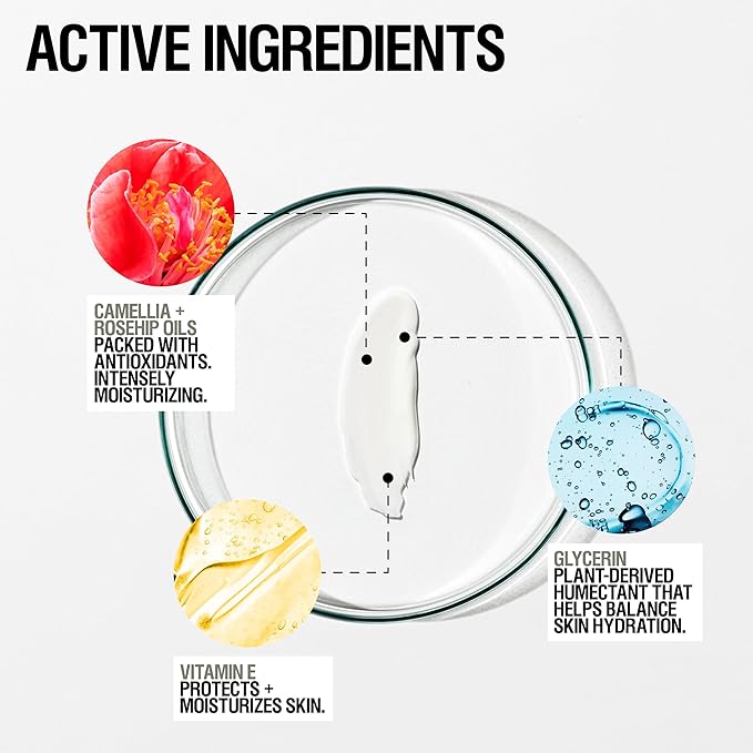 - FAST ABSORBING. This formula combines Aloe, Vitamin E and Glycerin, with Geranium and a blend of Camellia, Jojoba and organic Rosehip. Skin looks smooth and plumped with moisture