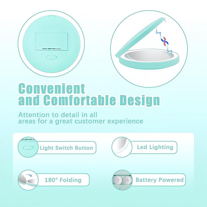 - [No Dead Ends to Create Exclusive Temperament]--The compact mirror with light can be freely opened to 180 degrees, reflecting the details of your face in all directions, allowing you to easily complete makeup from every angle. The high-definition mirror and moderate magnification can create perfect makeup for you while caring for the health of your eyes and adding points to your beauty.