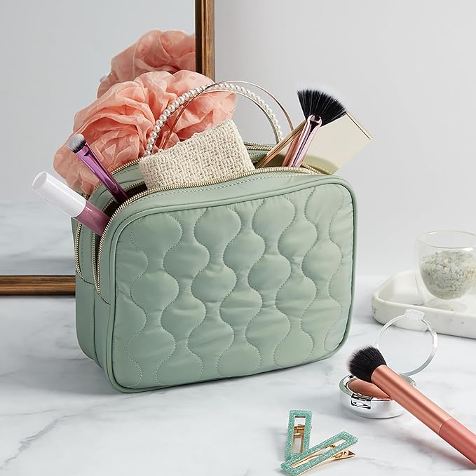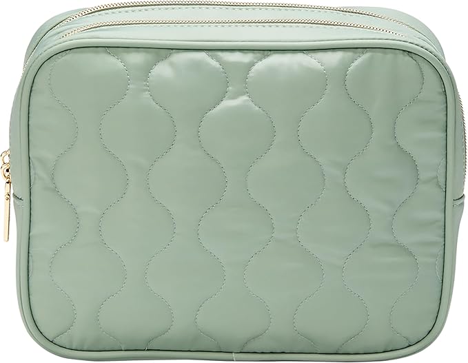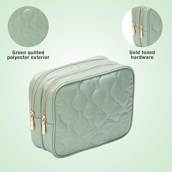 - CONAIR GREEN DOUBLE-ZIP ORGANIZER: Take-along green quilted bag for all your travel essentials.