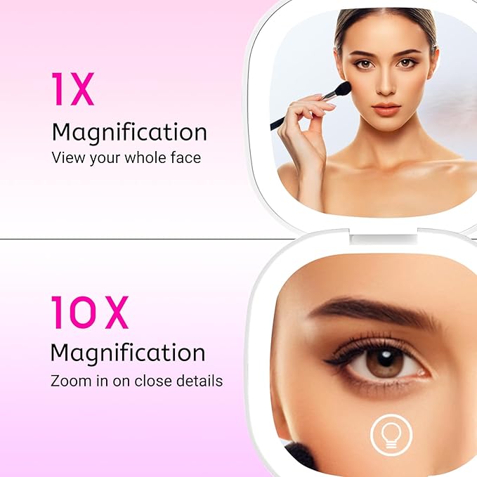 - Dual-Sided Magnification for Precision & Convenience This compact travel makeup mirror features 1X magnification for full-face application and 10X zoom for detail work (eyeliner, blemish removal). Pro tip: Hold 2-3 inches from face with 10X side to avoid dizziness. Perfect for mascara, lipstick, or contact lens routines.