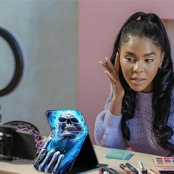 Blue Flame Skull Fingers Small Folding Travel Mirror Vanity Mirror 4.3"x2.75" PU Leather Portable Adjustable Rectangular Ultrathin Makeup Mirror,for Travel, Camping,Home