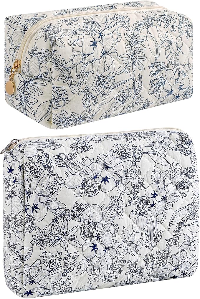 Makeup Bag Travel Cosmetic Bag for Women Girls, Zipper Make Up Pouch, Floral Flowers Toiletry Organizer Makeup, Portable Storage Bag, Cosmetic Travel Cloth Bag (2 Pack (L+S)/Navy Blue Flower)
