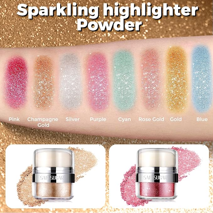 - Multi-functional Contouring Glitter:Add a shimmering touch of glow to your body with this versatile shimmer highlight powder. Perfect for eyes, cheeks, hair and body, this highlighter offers a variety of looks and shades in one compact package.