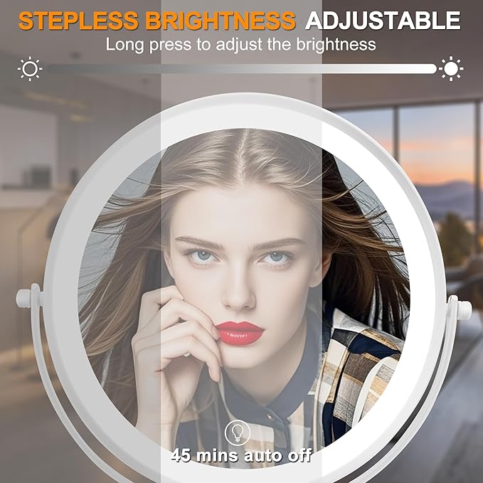 • 360Β° Rotation & Superior Brightness: Crafted with an all-glass mirror surface, our makeup mirror delivers exceptional brightness and clarity, surpassing traditional mirrors. The seamless design eliminates annoying reflections and enhances your viewing experience. Freely adjust the mirror to your ideal angle for visibility while applying makeup or enjoying your skincare routine, ensuring you're always at your best