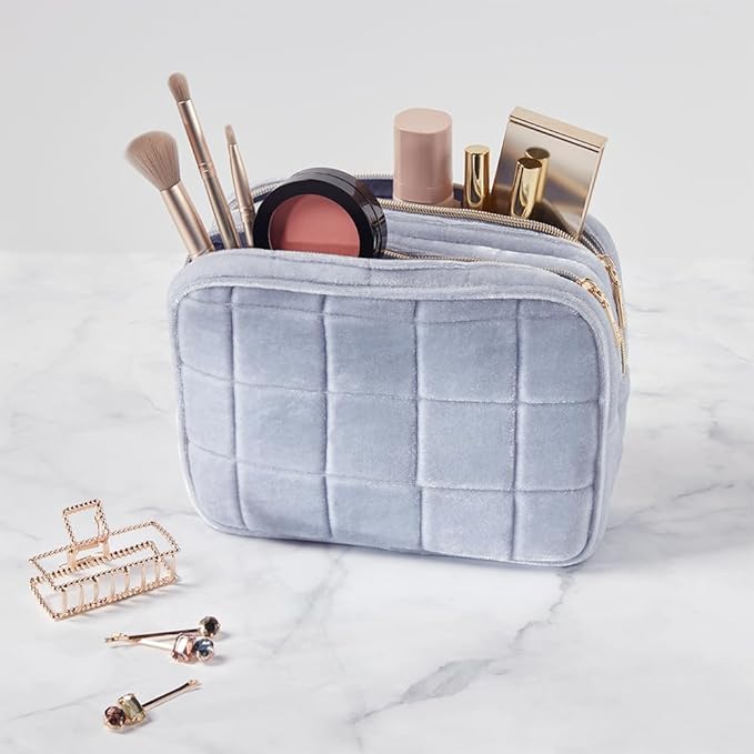 - Elegant Design: Crafted with soft, velvet-like blue polyester, this double zip toiletry bag exudes sophistication and style