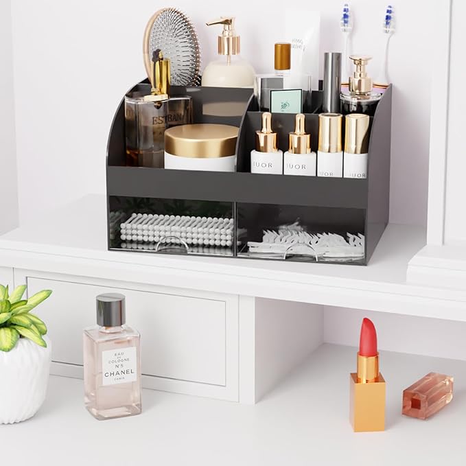 Makeup Organizer with Drawers, Cosmetic Storage for Dresser Vanity and Bathroom Countertop, Beauty Holder for Lipstick Brush, Skincare Organizer for Vanity, Cosmetic Display Case (Black)