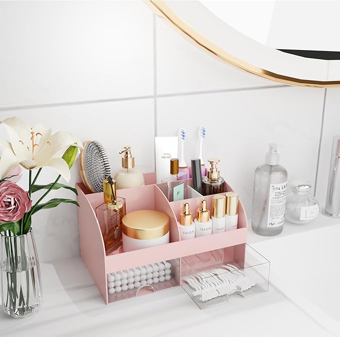 Makeup Organizer with Drawers, Cosmetic Storage for Dresser Vanity and Bathroom Countertop, Beauty Holder for Lipstick Brush, Skincare Organizer for Vanity, Cosmetic Display Case (Pink)