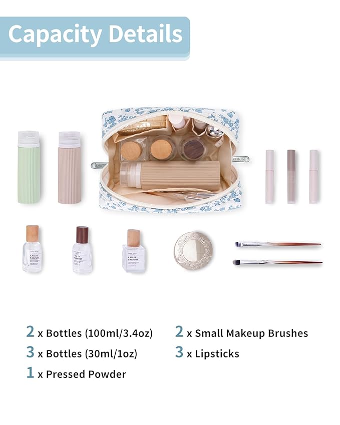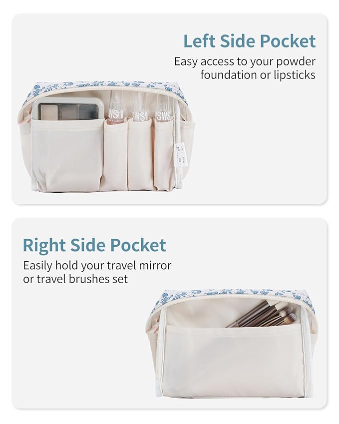 - Multiple Storage Compartments - Practical main compartment with 5 inner small pockets could neatly organize your makeup. Main compartment could hold many small items. Left side pockets could hold your concealer or lipsticks, while right side pocket are great for your travel mirror or travel brushes set. It could fit lipstick, blushes, powder, eyeliner, foundation, concealer, eyeshadow pallet, mascara, lash curler, sponage, small brushes
