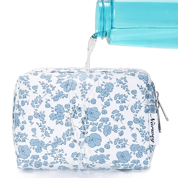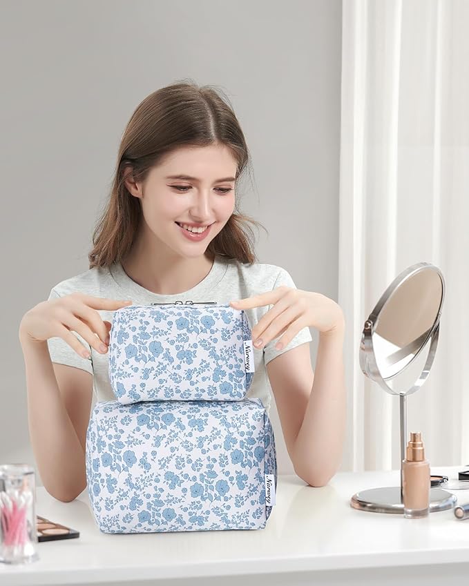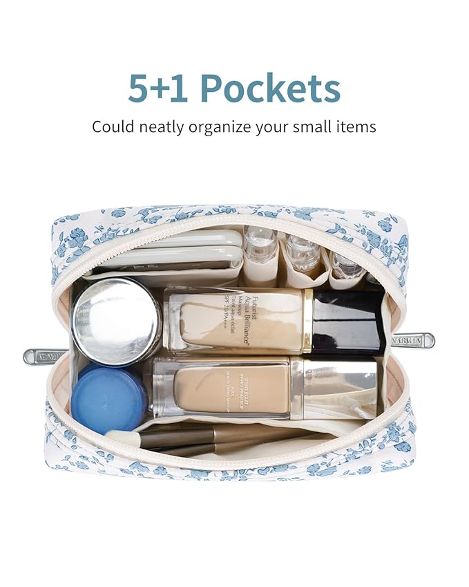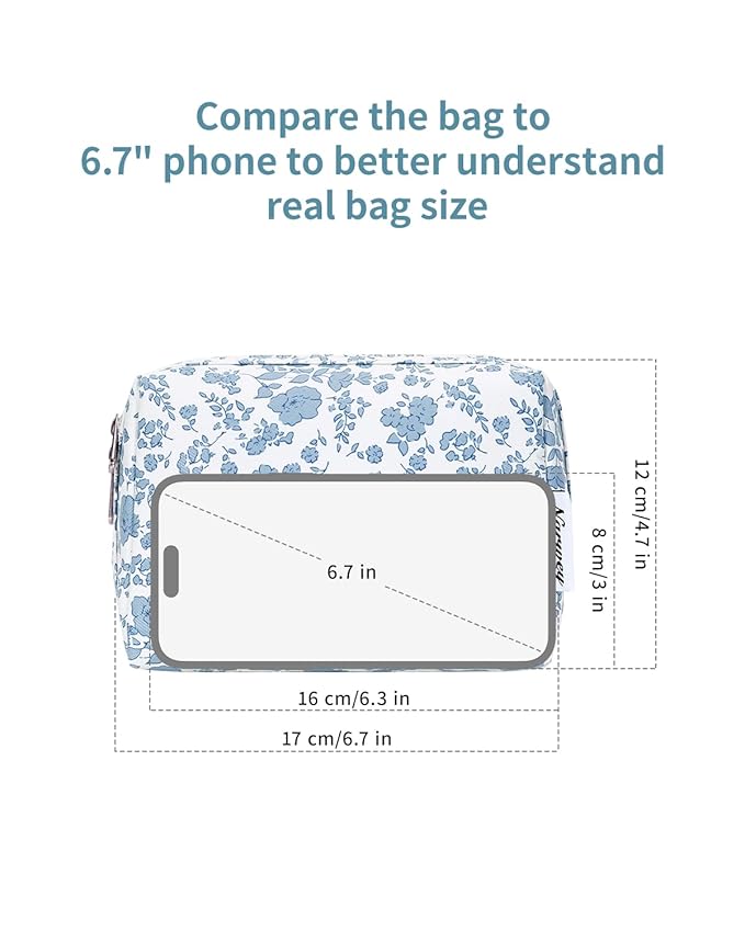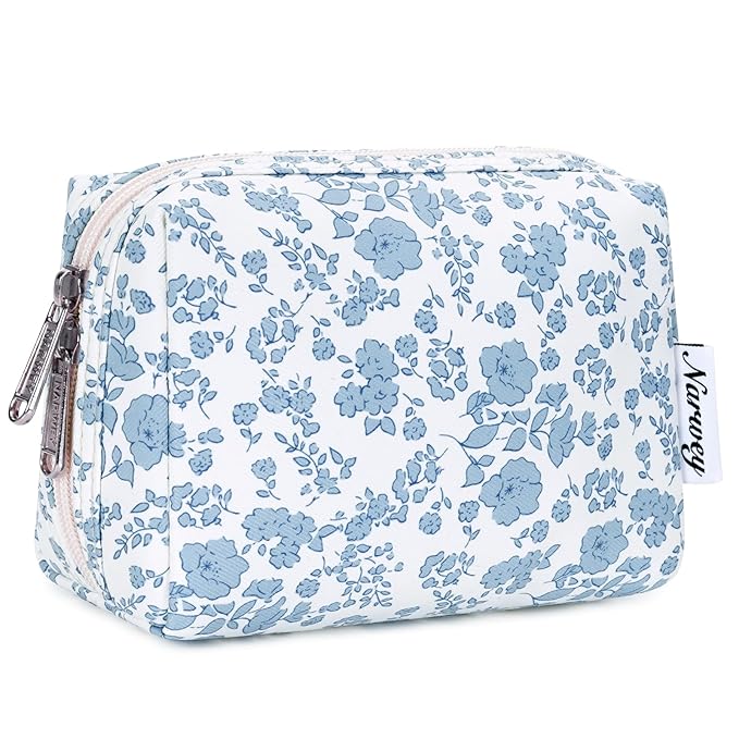 Narwey Small Cute Floral Makeup Bag for Purse Mini Cosmetic Bag Travel Makeup Pouch Zipper Pouch Cute Make up Bags with Compartments for Women Girls (Little Blue Flower, Small)