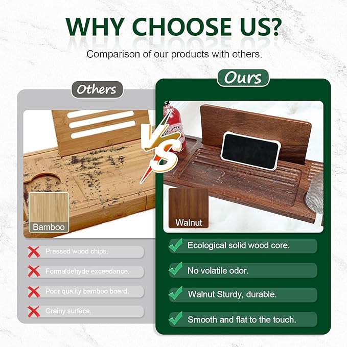 - Premium Bathtub Tray: This handcrafted bathtub tray redefines luxury self-care routines with its premium walnut wood construction. Every bath tub tray wood is meticulously sanded and finished to highlight natural wood grains, creating a spa-worthy centerpiece for your tub. The bath tub trayβs minimalist yet sophisticated design complements modern and traditional bathrooms alike. Unlike flimsy plastic alternatives, this bath tray for tub boasts durable hardwood that resists water warping.
