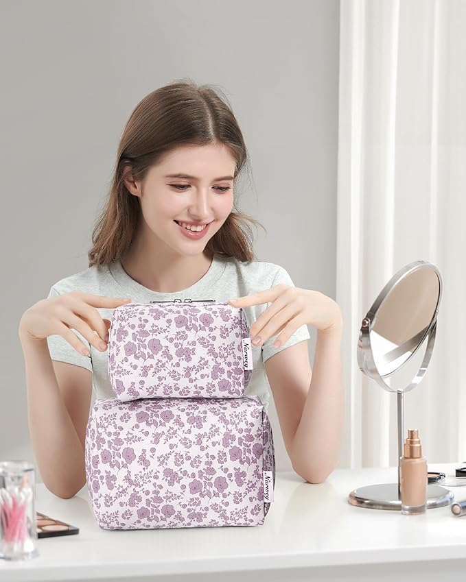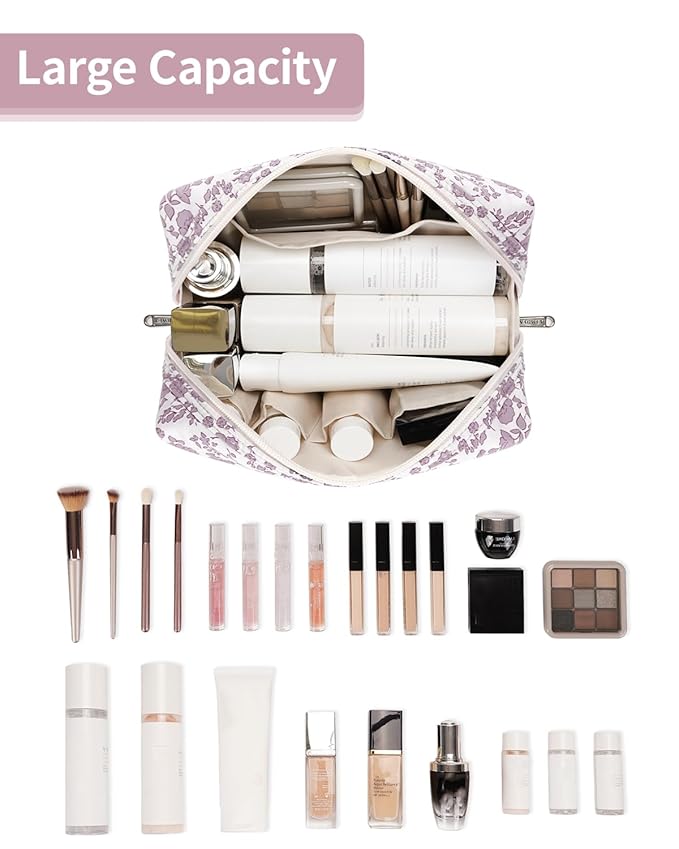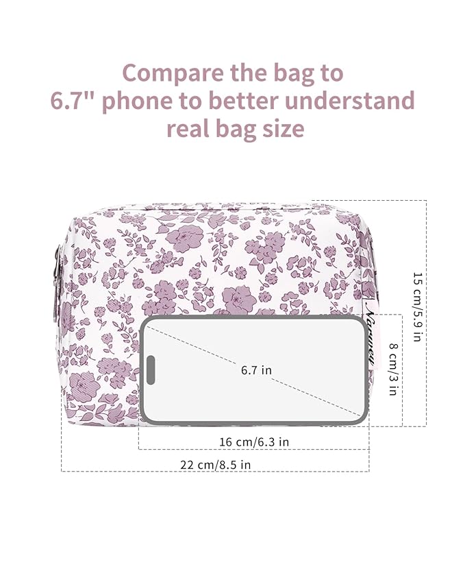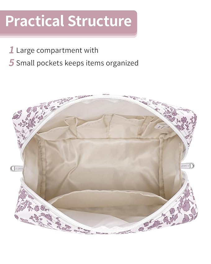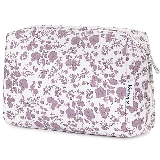 Narwey Cute Floral Makeup Bag Travel Cosmetic Bag Organizer Toiletry Bag Make Up Bags with Organized Pocket for Women Girls (Large, Little Dusty Pink Flower)