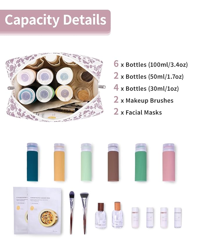 - WELL-ORGANIZED COMPARTMENTS. Practical main compartment with 5 inner small pockets could neatly organize your makeup. Main compartment could easily hold travel-size toiletries or skin-care products. It could fit 3 brushes, eyeliners, foundation, concealer, lipsticks, blushes, powder, eyeshadow pallet, mascara, lash curler, sponges, sunscreen, 3oz lotion, cream, facial cleanser and toothpaste