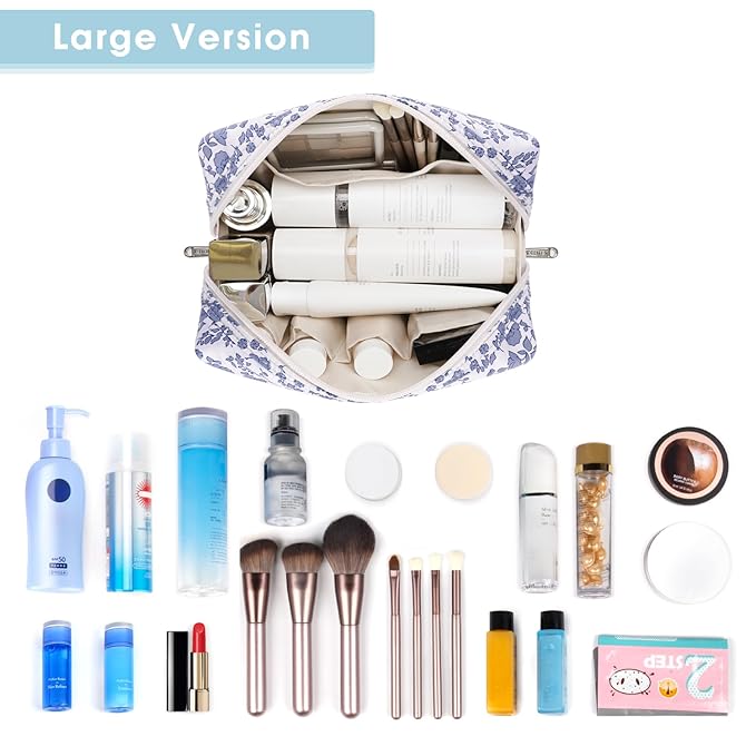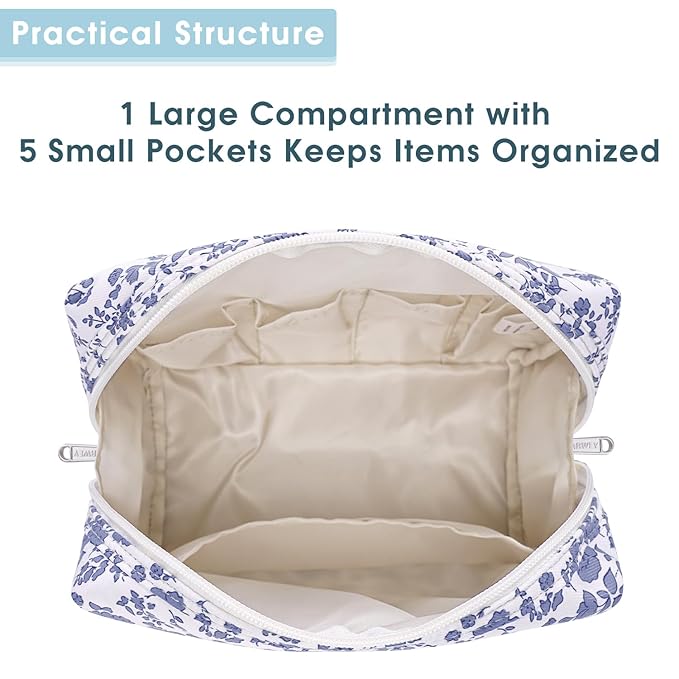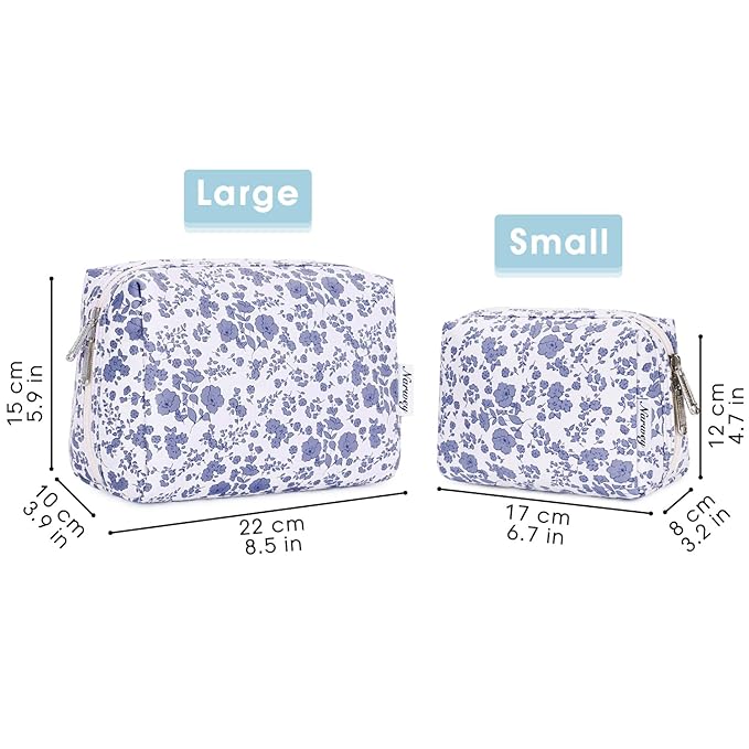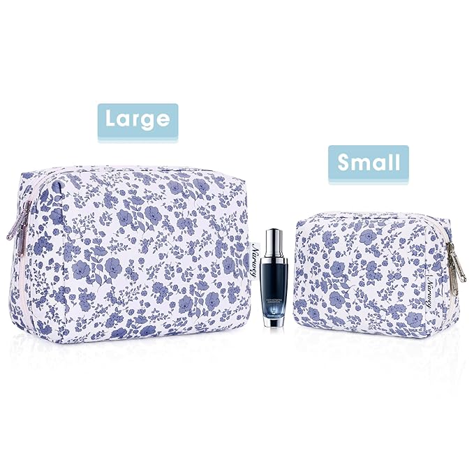 Narwey Cute Floral Makeup Bag Travel Cosmetic Bag Organizer Toiletry Bag Make Up Bags with Organized Pocket for Women Girls (Large, Little Grayish Blue Flower)