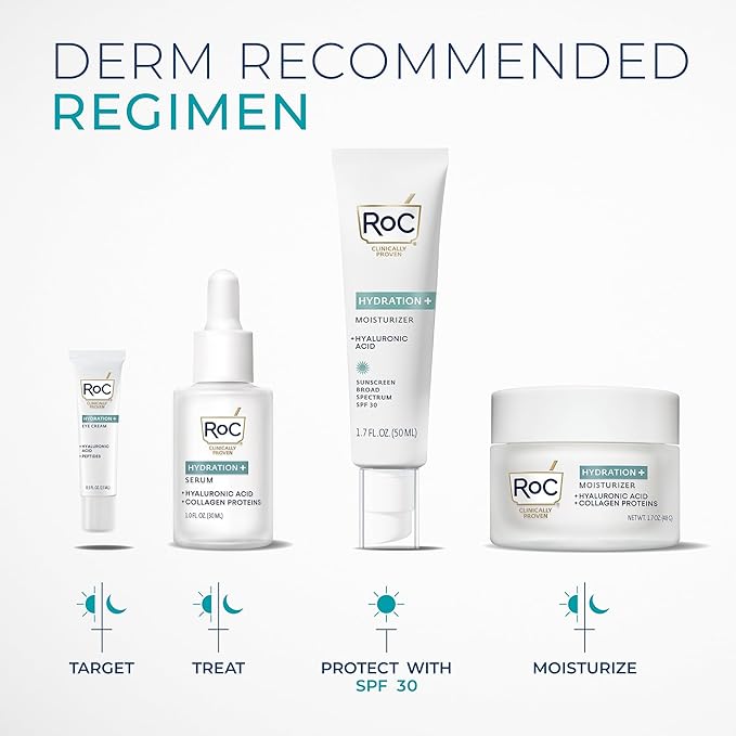 RoC Hydration+ Hyaluronic Acid Moisturizer Face Cream, Hydrating, Smoothing, Fragrance Free Formula with Collagen Proteins (1.7 Ounces) with Retinol Eye Cream Packette