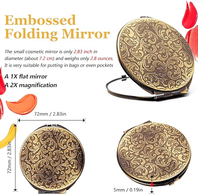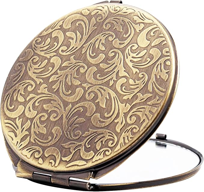 Retro metal compact travel mirror 1x/2x magnification compact portable foldable, used as a compact magnifying glass for wallets and pockets, distortion free folding portable compact mirror (bronze)