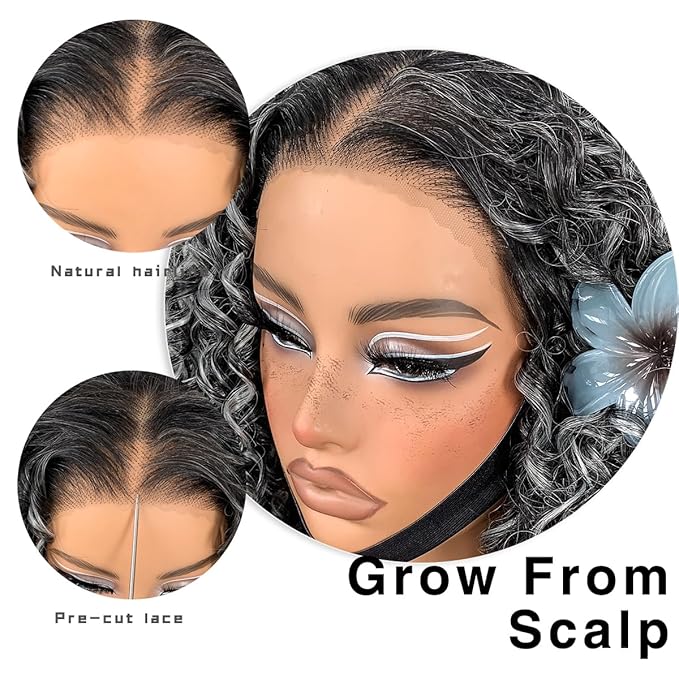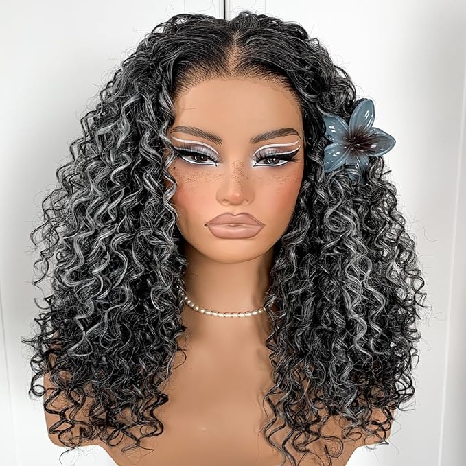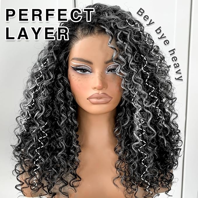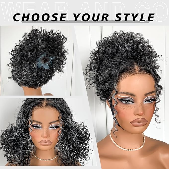 Grey Highlight Curly Wig Wear And Go Glueless Synthetic HD Lace Afro Wig 13x6 Black And White Skunk Stripe Kinky Curly