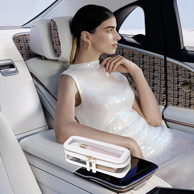 Makeup Brush Case Clear Travel Cosmetic & Toiletry Bag Slim Makeup Bag with Zipper Small Purse Organizer Car Essential Bag for Women (White, SLIM-1)