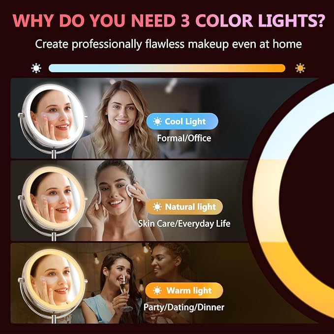 • 【3 Colors & Brightness Adjustable】This desktop makeup mirror is furnished with three distinct light sources: cool light, natural light, and warm light. This design enables users to select the most appropriate light source based on various environments and personal preferences. It supports infinite brightness adjustment, allowing users to freely adjust the brightness from 10% to 100% as required. It features an automatic memory function, capable of remembering the user's last-used brightness and color temperature settings.